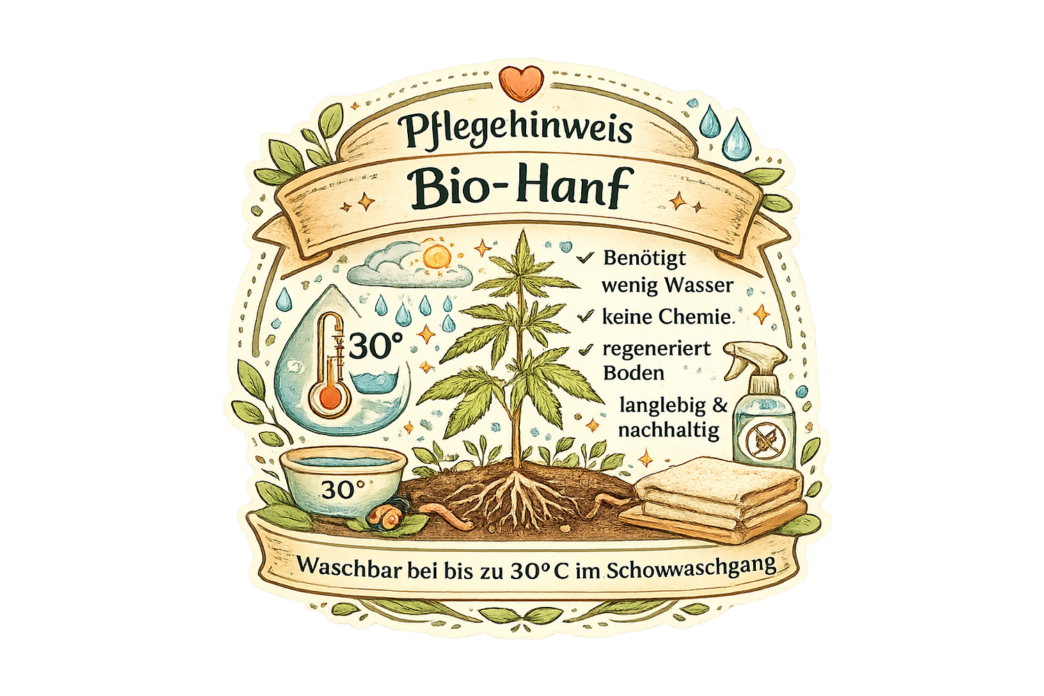 Wo Hanf funktional nicht geeignet ist, verwenden wir Bio-Baumwolle statt konventioneller Baumwolle – insbesondere bei bedruckten Textilien.