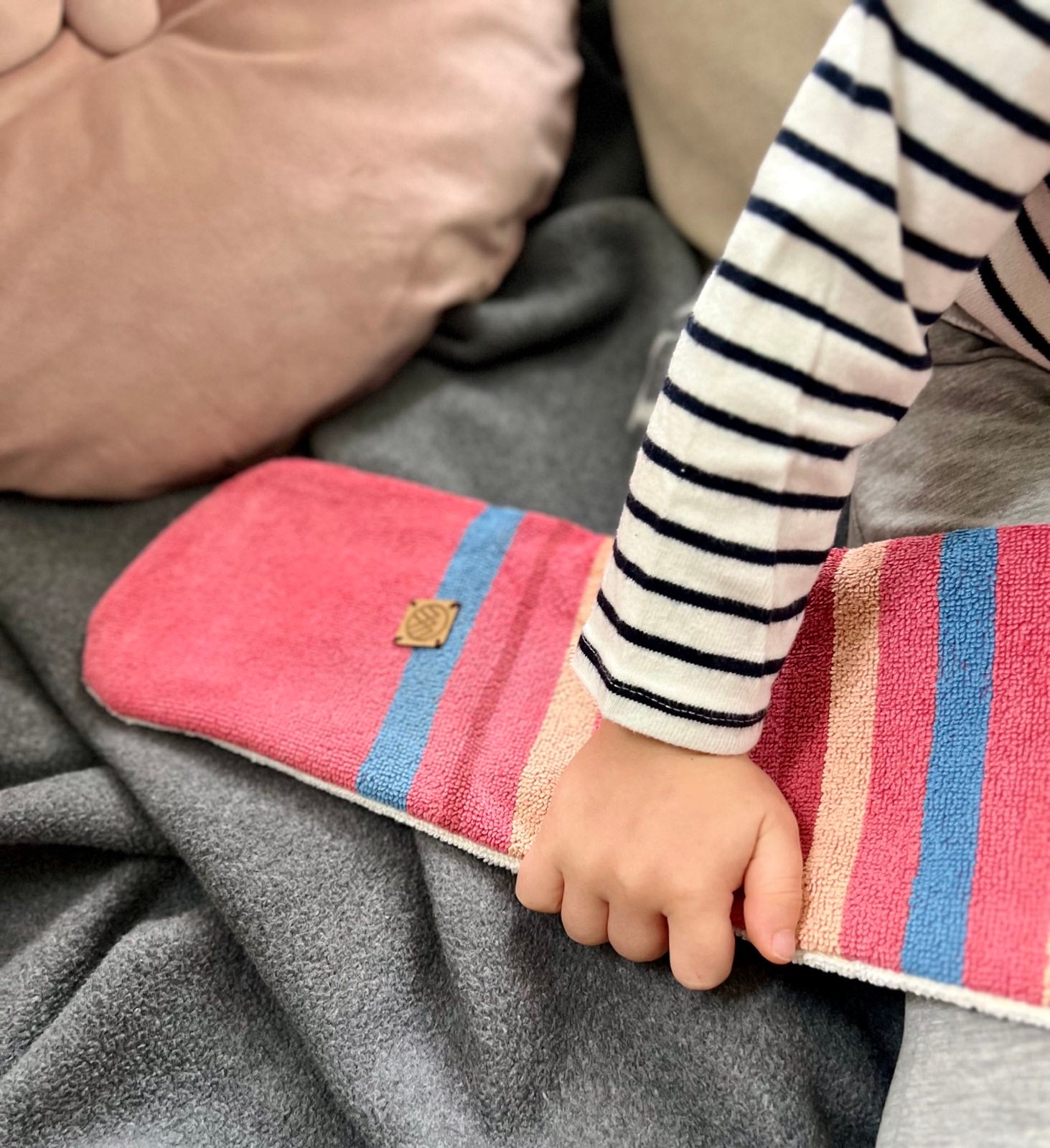 Der Bezug besteht aus einem wiederverwendeten Handtuch. Perfektes Upcycling!